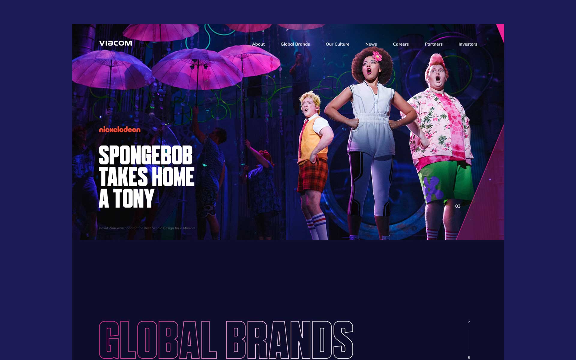 With the MediaMonks team, I was fortunate enough to help Viacom develop a punchy, new corporate website right when they were in the middle of launching a rebrand. Corporate websites often play it safe, but we wanted to make Viacom’s site just as much fun to explore as Viacom’s networks are to watch, which often push envelopes with a playfully rebellious attitude. A big part of this process was to highlight Viacom’s massive library of great content. To achieve this, we implemented several fun interactions and tactile elements into the design. We call this “cherry content,” named after the “cherry on top” of a cake or sundae. This unobtrusive content serves to prove and support the value proposition that brands put forward, allowing users to choose to scroll by or dive deeper by interacting with it directly.